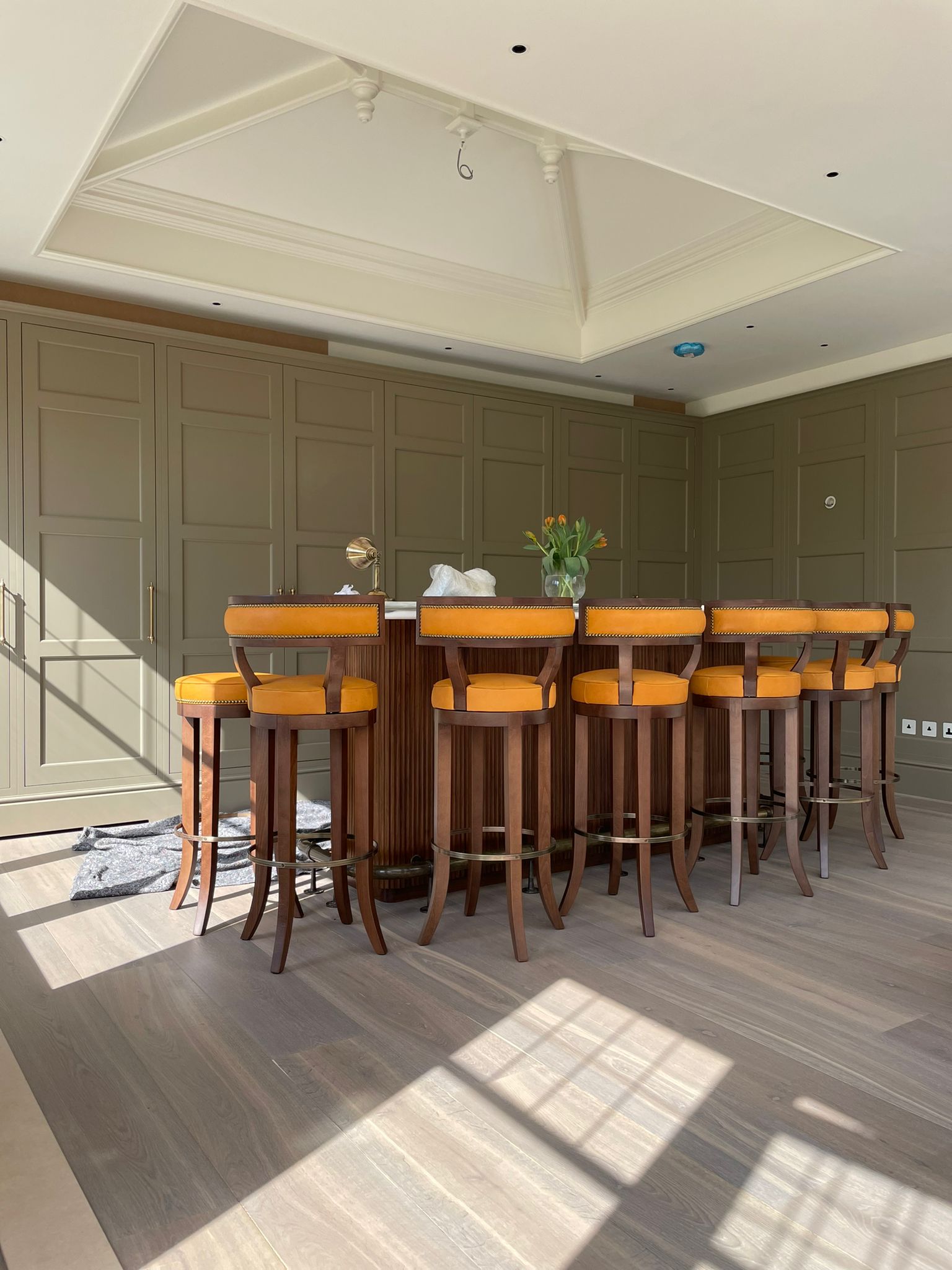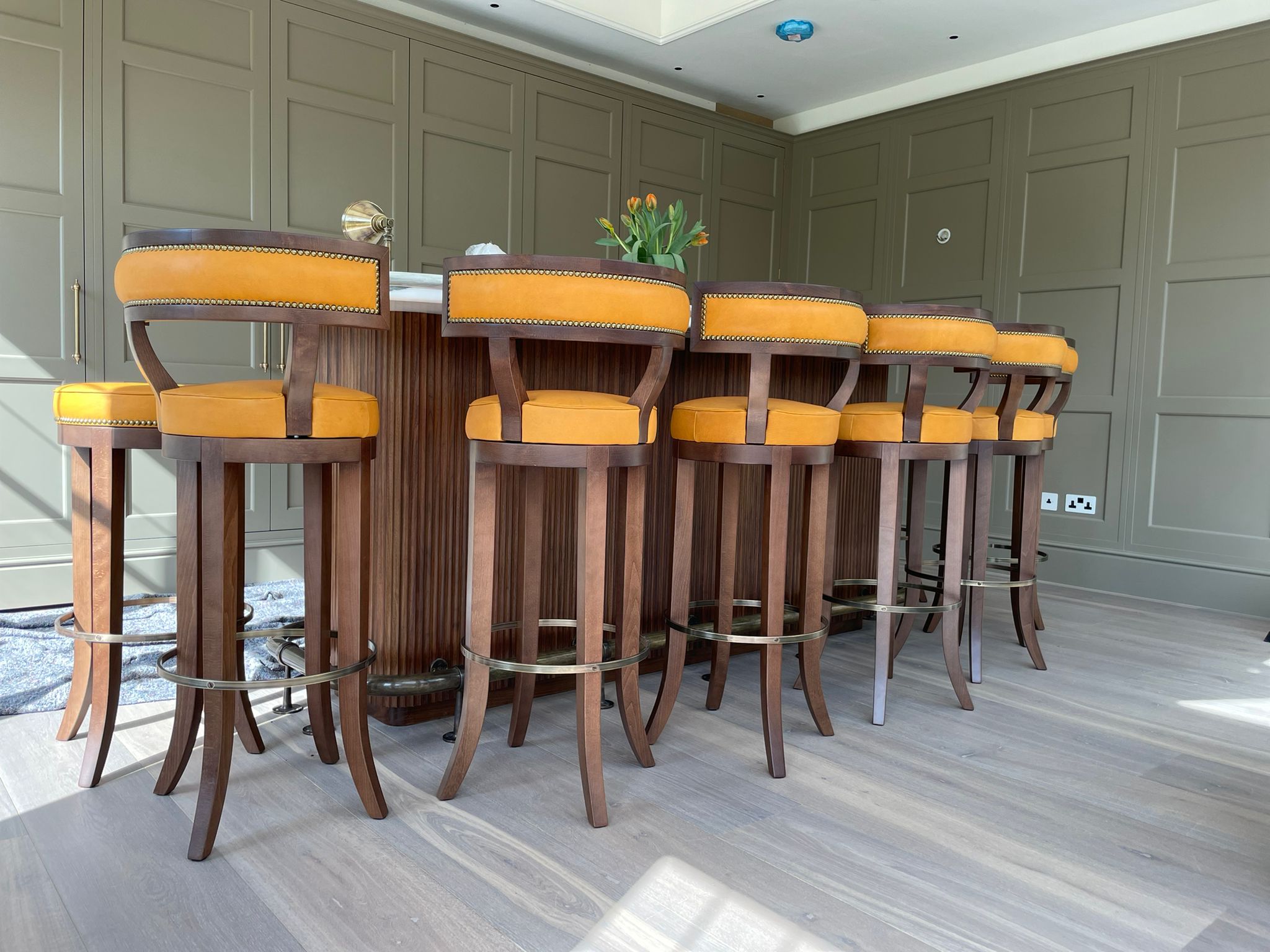 A classic barstool design with an elegant, modern twist. The Langham features solid wood frame available in the colours of the collection, hand applied studs, solid bronze foot ring and swivel seat.