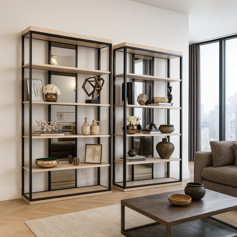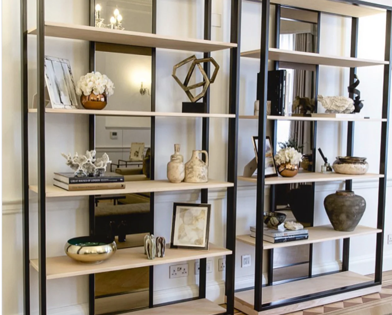 The stunning Dalton shelving system is a fully bespoke'able system which brings together metal elements, mirror panels and elegant timber sections resulting in a display that is as elegant as it is functional.