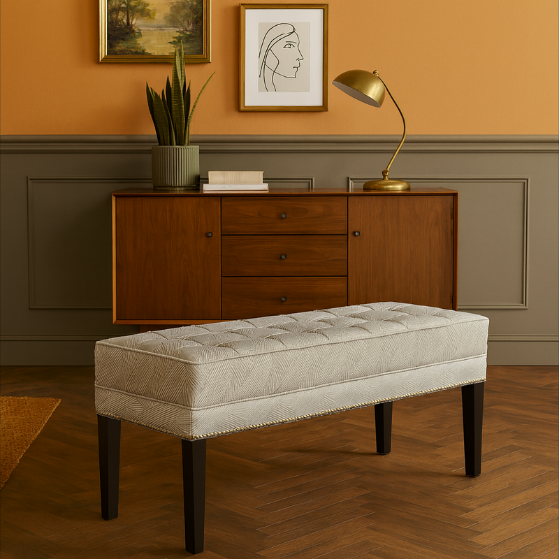 The Bartlett is a regency inspired bench which features cut and stitched panels to the top separated by elegant piping. A luxurious line of hand applied studs and solid show wood timber base. Available in a number of sizes and in the colours of the collection.